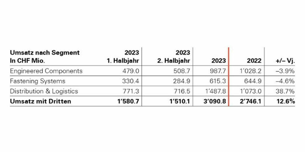 Im Geschäftsjahr 2023 erreichte SFS dennoch ein robustes organisches Wachstum von 2.1%. Der Umsatz mit Dritten (Umsatz) stieg insgesamt um 12.6% auf CHF 3’090.8 Mio. Konsolidierungseffekte aus der am 1. Mai 2022 vollzogenen Einbindung von Hoffmann trugen 14.6% zur Umsatzsteigerung bei. Starke Währungseffekte bremsten die Entwicklung mit –4.1%. Auf vergleichbarer Basis beschleunigte sich das Wachstum im zweiten Halbjahr um 2.4 Prozentpunkte gegenüber dem ersten Halbjahr.