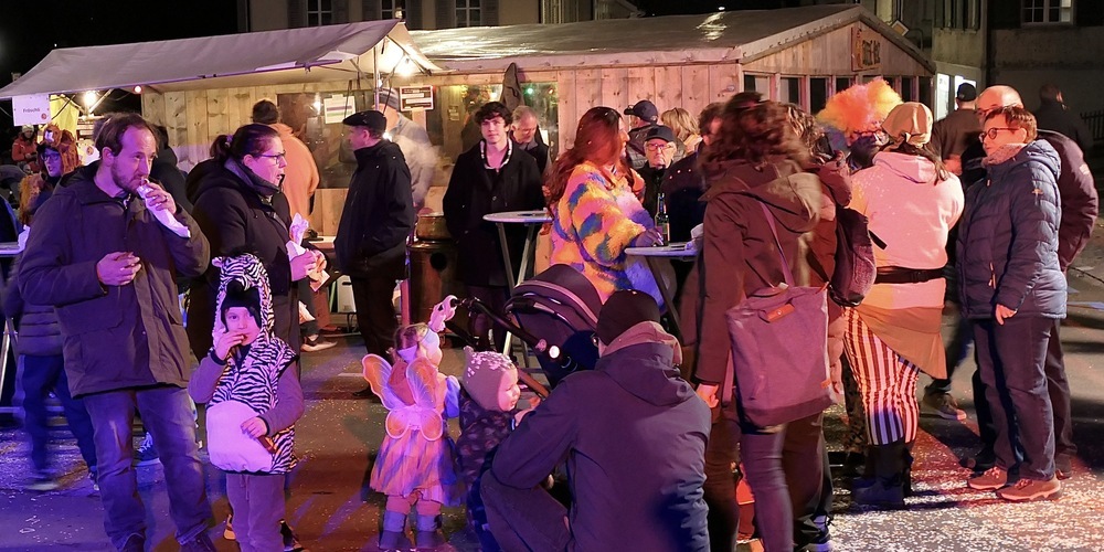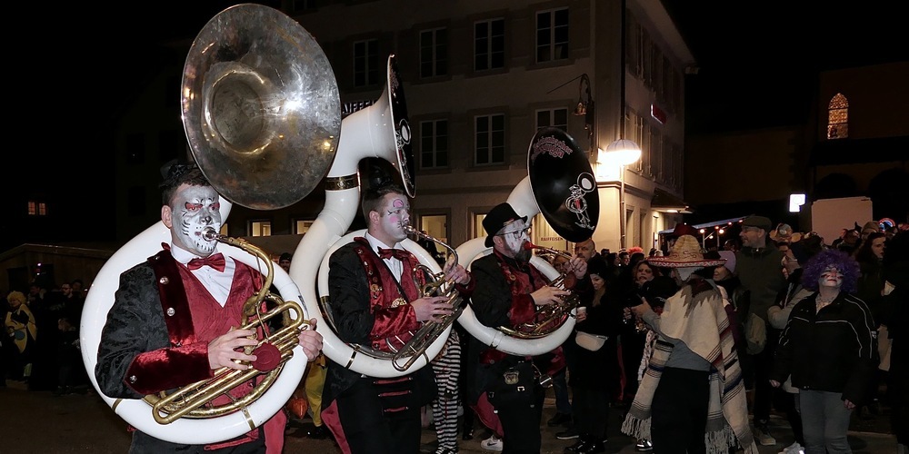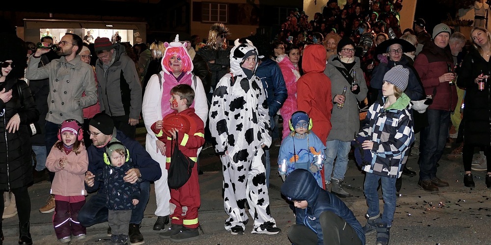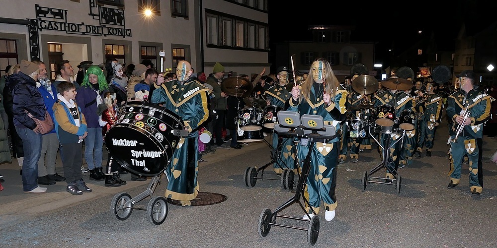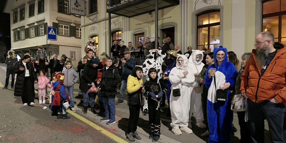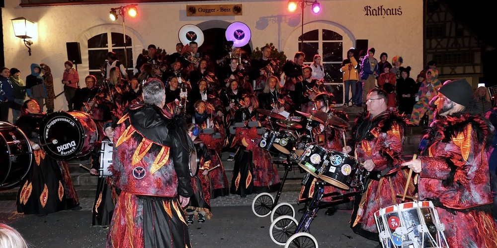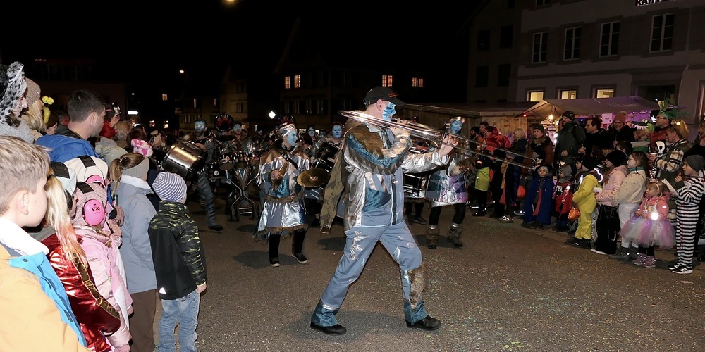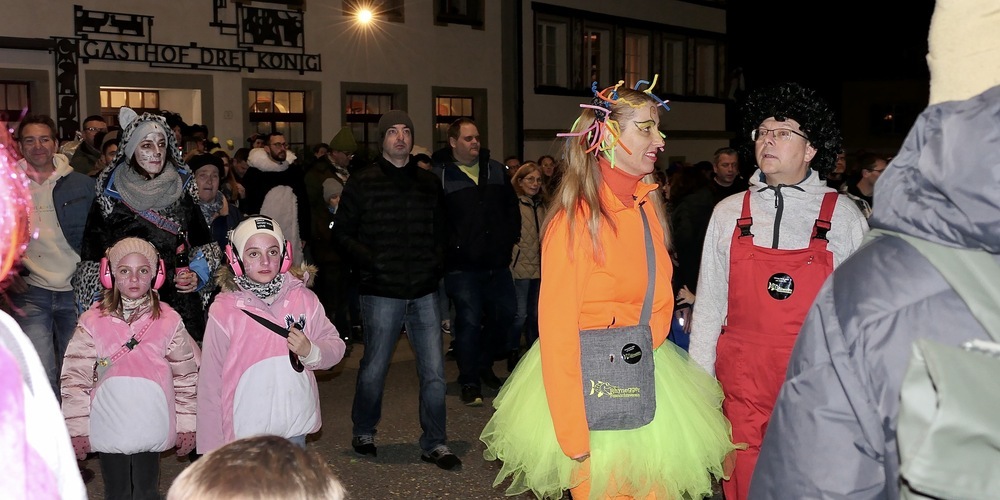 Pünktlich um 18.37 Uhr, dem traditionellen Startzeitpunkt des kurzen Umzugs der acht auftretenden Guggengruppierungen hatte sich auch der Platz vor dem Rathaus wieder mit Mäschgerle und solchen, die als sich selber verkleidet waren, gefüllt.