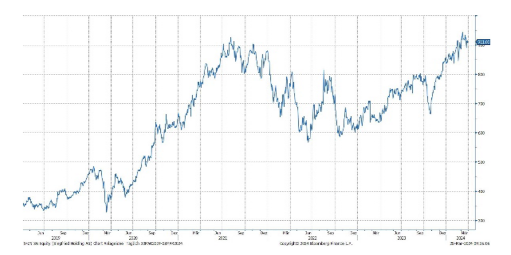 Kurs am 27.03.2024 CHF 907.50; 52 Wo Hoch/Tief CHF 950.00/628.55; Valor 1.428.449; Geschätztes KGV 2024: 26.35x; Dividendenrendite ca. 0.42%.