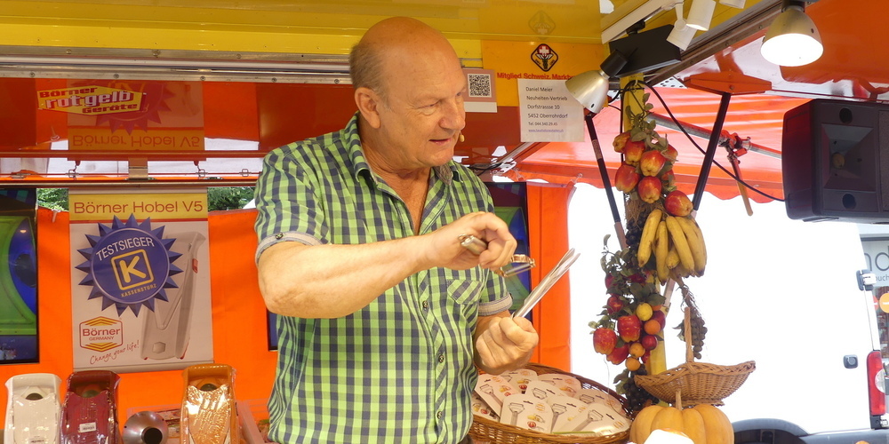 Ob Stängeli oder Würfeli, ob Scheiben oder in Schraubenform, mit diesem Gemüsehobel würden alle Wünschen von Hausfrau oder Hausmann erfüllt. «Ich bin sehr zufrieden mit dem Geschäft heute», strahlte der sympathische Aargauer, «Das Hauptgeschäft war schon vor zwölf Uhr mittags, da ist es sehr gut gelaufen.»