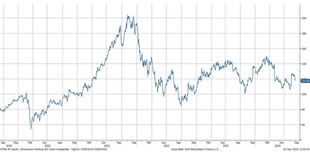 «Straumann ist ein weltweiter Anbieter im Bereich der dentalen Implantologie, restaurativen Zahnmedizin und oralen Geweberegeneration. Das Management hat Mitte August dank eines guten Geschäftsverlaufs die Ziele für das Gesamtjahr 2024 angepasst. So strebt das Unternehmen neu ein organisches Umsatzwachstum im niedrigen zweistelligen Prozentbereich an. Die währungsbereinigte operative Marge wurde von zuvor 26 % auf rund 27 % bis 28 % angehoben. Die angehobenen Ziele kamen überraschend, da zahlreiche Konkurrenten zuletzt eher mit negativen Nachrichten für Schlagzeilen gesorgt hatten.