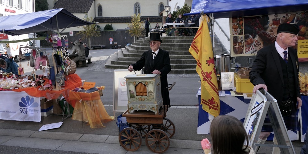 Doch nicht nur Kulinarisches wurde geboten. An vielen Ständen gab es das typische Marktwarenangebot. Denn wo sonst findet man innert weniger Meter Messerschärfer und Lederreiniger, energetisch aufgeladene Säftchen und Spielwaren? Dazu Kleidung, Cremen oder schottische Waren. Schottisch? Ja, direkt vor dem Rathaus lockte ein Stand samt Betreiber in original schottischem Kilt zum Kauf von schottischen Produkten. Darunter natürlich Whisky und Likör.