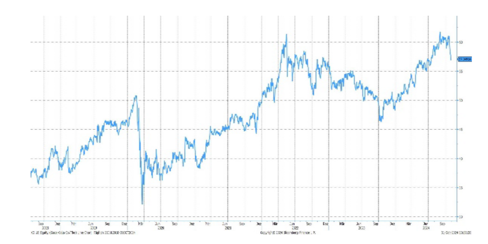 «Die Coca-Cola Company ist Weltmarktführerin in der Herstellung und Vermarktung von alkoholfreien Getränken. An 133 Produktionsstandorten weltweit werden rund 79'000 Mitarbeiter beschäftigt. Der Umsatz unterteilt sich in die beiden Bereiche Verkauf von Getränkekonzentraten und Sirupen (56%) und Abfüllung und Verkauf von Getränken (44%). Zur Gesellschaft gehören nebst Coca-Cola auch Marken wie Fanta, Sprite, Schweppes Dasani, Fresca, Minute Maid u.v.m. Die vor wenigen Tagen bekanntgegebenen Quartalszahlen per 30.9.24 lagen über den Analystenerwartungen.
