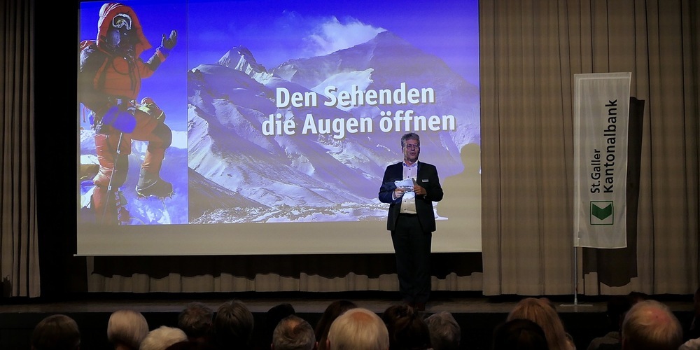 Markus Thür, Geschäftsstellenleiter der St.Galler Kantonalbank in Altstätten, der bereits die rund 100 erschienenen Kunden der Bank begrüsst hatte, bedankte sich bei Andy Holzer für seinen faszinierenden Vortrag und lud die Anwesenden ein, sich bei einem Apéro riche noch über die gewonnenen Erkenntnisse zu unterhalten oder mit dem blinden Profibergsteiger das persönliche Gespräch zu suchen.
