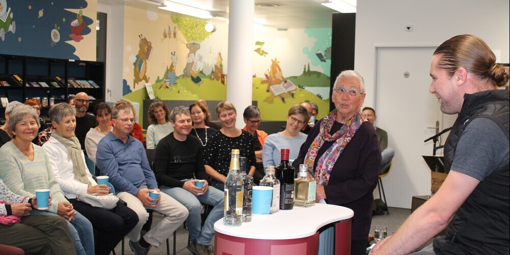von Lesung, Musik und Degustation, der alle Sinne ansprach und beim Publikum grossen Anklang fand. Eigens für diesen Abend hatte sich die bekannte Diepoldsauer Mundart-Autorin Berta Thurnherr-Spirig im Vorfeld mit dem Wacholderbranntwein beschäftigt.