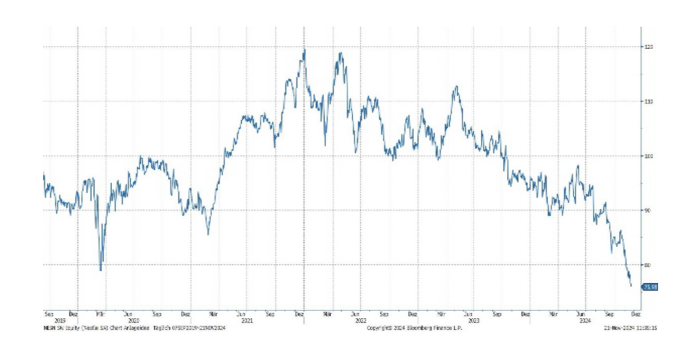 Kurs am 21.11.2024 CHF 75.96; 52 Wo Hoch/Tief CHF 100.82/75.76; Valor 3.886.335; geschätztes KGV 2024: 16.50x; Dividendenrendite ca. 3.98%.