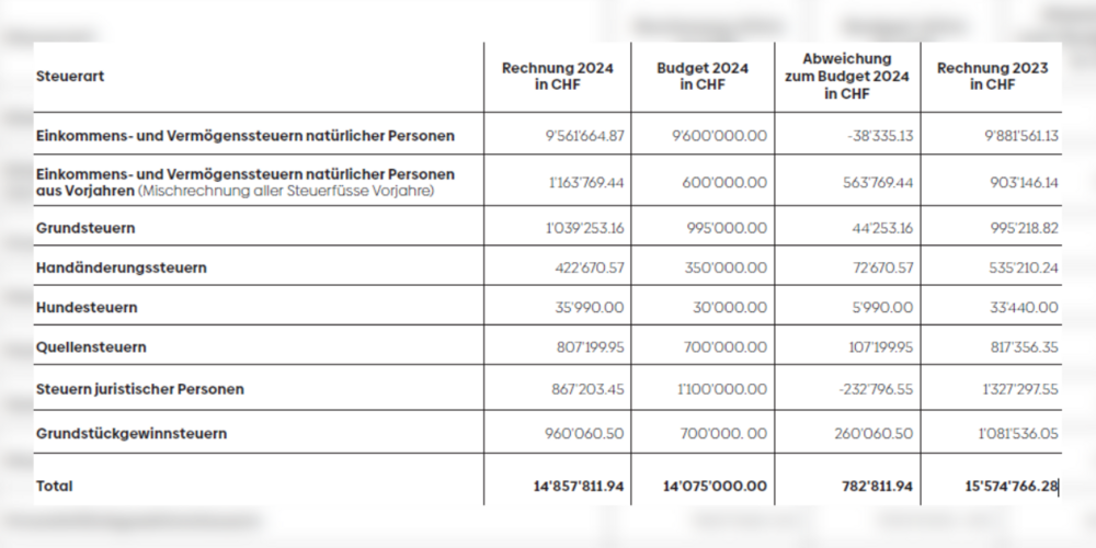 Die politische Gemeinde Berneck verzeichnet bei Gesamtsteuereinnahmen von CHF 14,86 Mio. mit einem Plus von CHF 0,78 Mio. einen erfreulichen Steuerabschluss 2024. Die Mehreinnahmen ergeben sich massgeblich aus den Steuern der natürlichen Personen aus den Vorjahren (+ CHF 564‘000) sowie den Grundstückgewinnsteuern (+ CHF 260‘000) und den Quellensteuern (+ CHF 107‘000), den Handänderungssteuern (+ CHF 73‘000) und den Grundsteuern (+ CHF 44‘000).
