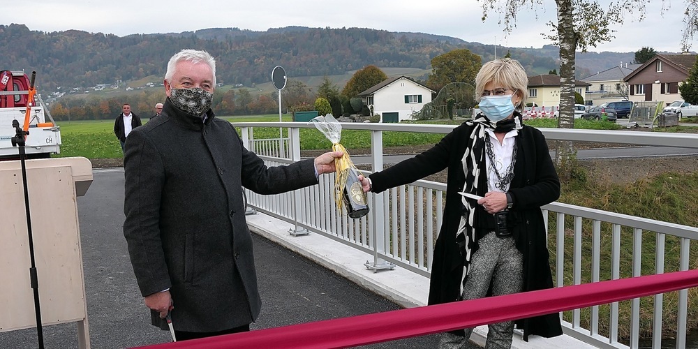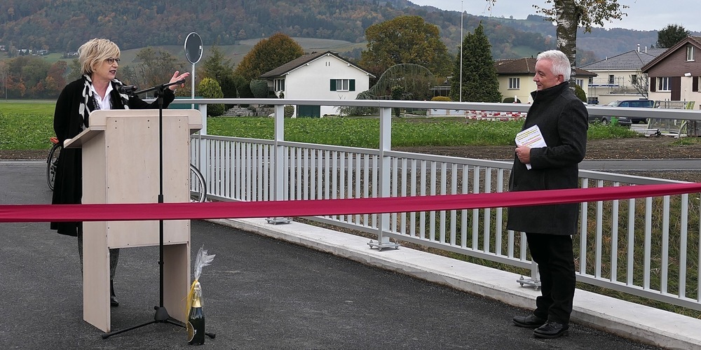 Deshalb wohnte auch Widnaus Gemeindepräsidentin Christa Köppel der Eröffnungsfeier bei, lobte die aussergewöhnlich guten nachbarschaftlichen Beziehungen und erzählte eine kleine Geschichte. Denn diese Brücke beschäftigte ja schon jahrelang die Vorgänger als Gemeindepräsidenten sowohl in Widnau als auch in Diepoldsau. Letztlich kam es zu einer Wette zwischen Christa Köppel und Roland Wälter. Die Widnauer Gemeindepräsidentin war sich nämlich nicht ganz sicher, ob man die Eröffnung des neuen Bauwerks noch in der aktuellen Funktionsperiode durchführen könne. Diepoldsaus Gemeindeoberhaupt hingegen war überzeugt, das noch hinzukriegen. Und hat die Wette um eine Flasche Schampus damit gewonnen. Eine Flasche Schampus, die Christa Köppel zur Eröffnungsfeier mitbrachte und dem Wettsieger übergab.