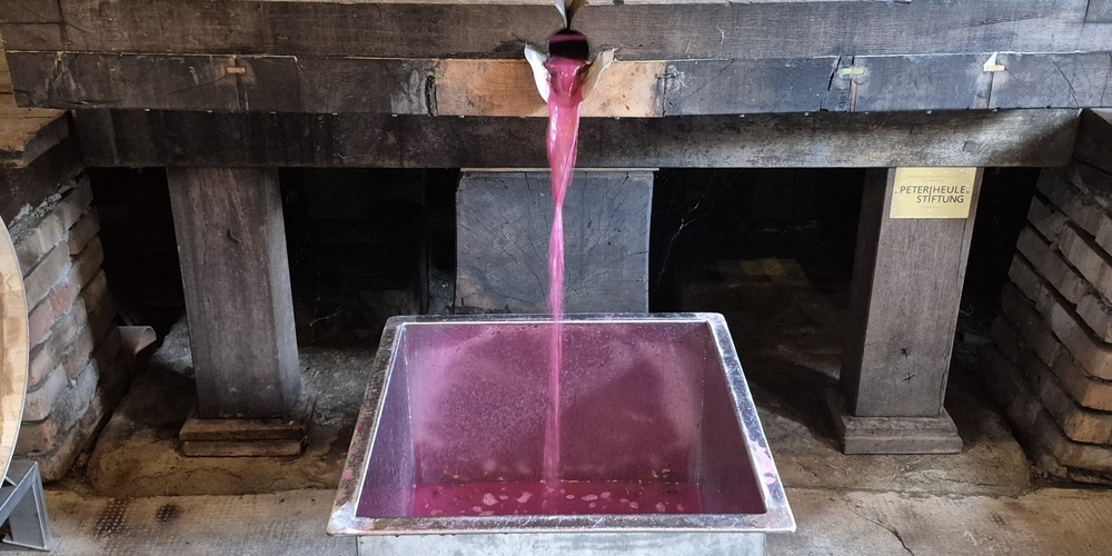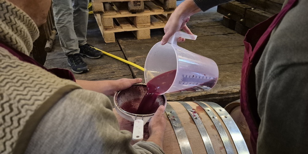 In einem Behälter unten wurde anschliessend der in Strömen fliessende Wein gesammelt und von Hand in Fässer abgefüllt. Man merkte: Der Wein war hier nicht einfach nur ein Getränk, sondern eine Leidenschaft. Der abgefüllte Wein wird nun in Berneck gelagert, bis er in den nächsten Jahren beispielsweise in Restaurants serviert wird.
