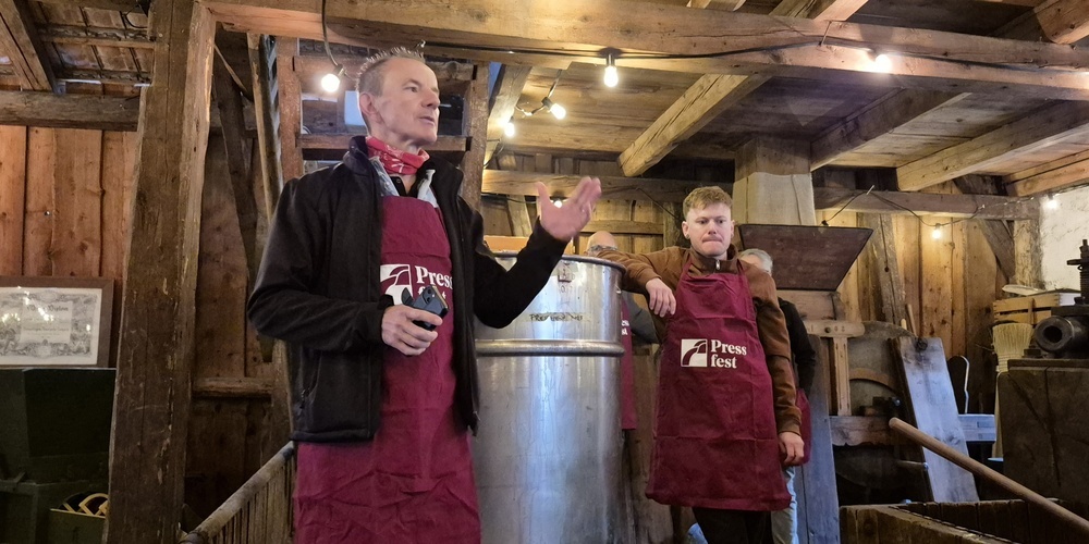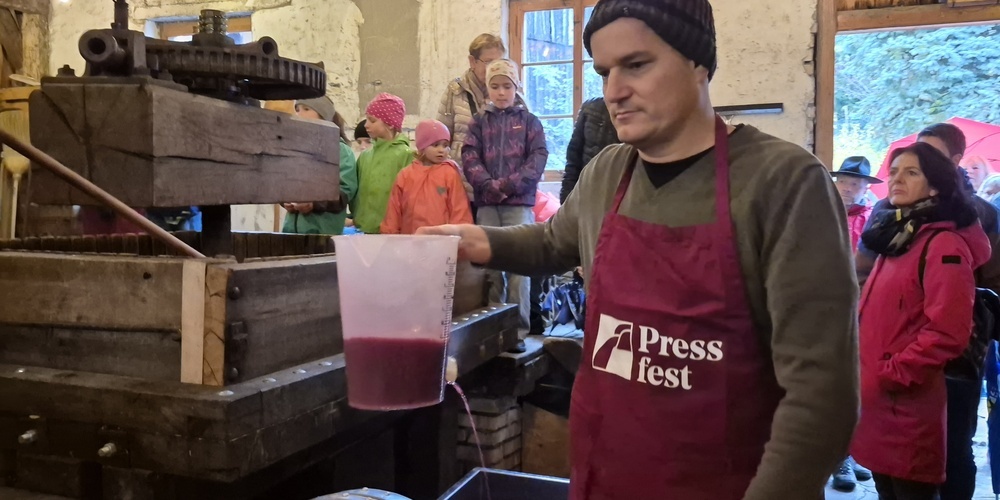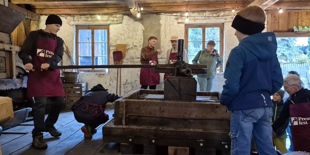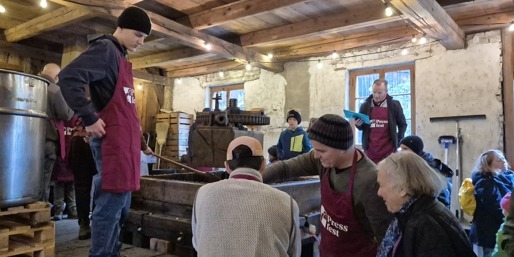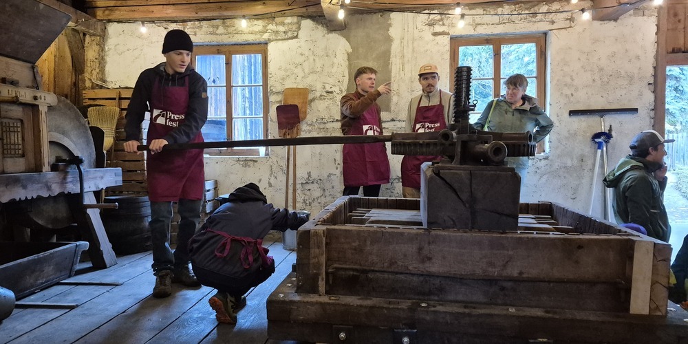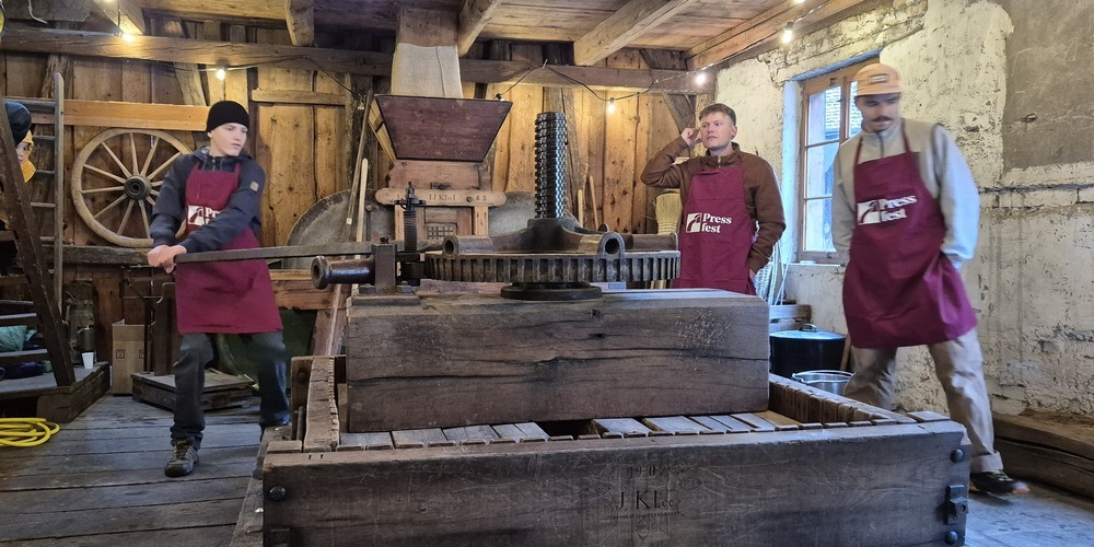 Die Festwirtschaft startete bereits früh am Morgen und der Höhepunkt stand kurz nach dem Mittag bereits an: Die über 120 Jahre alte Presse wurde in Bewegung gesetzt und der Wein begann zu fliessen. Das System ist dabei so simpel wie genial. Zwei Holzbalken werden durch ein an einem Gewinde festgeschraubtes Holzstück immer weiter nach unten gepresst. Die Presse selber wird durch Muskelkraft von einer oder zwei Personen bedient, die einen Hebel schieben, resp. ziehen. Hier wurde noch alles von Hand und mit Leidenschaft gemacht. Einen automatisierten Prozess suchte man vergebens.