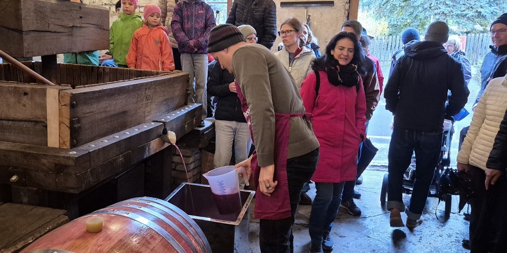 Besucher erwartete im altehrwürdigen Torkel an der Breite ein Erlebnis der besonderen Art: Balger Trauben wurden mit der über 120 Jahre alten Pressmaschine von Hand und mit Muskelkraft gepresst und abgefüllt.