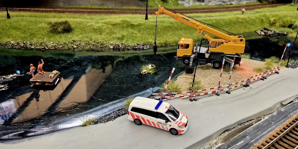 Anstatt dass aber einfach nur ein Modellauto in den «See» gelegt wurde, haben sich die Clubmitglieder die Mühe gemacht und eine Polizeiabsperrung sowie Bremsspuren am Ufer hergestellt. Damit wird die Geschichte erzählt, dass das Auto wohl mit überhöhter Geschwindigkeit auf der Strasse unterwegs war, die Kontrolle verlor und dann in einem verzweifelten Bremsversuch eine Landung im Wasser verhindern wollte.