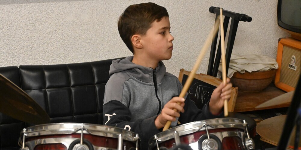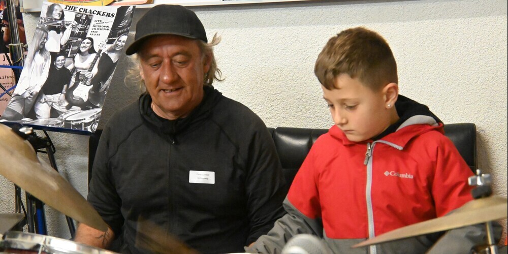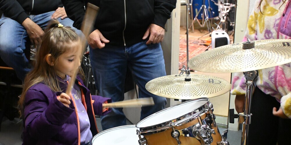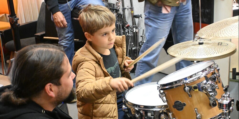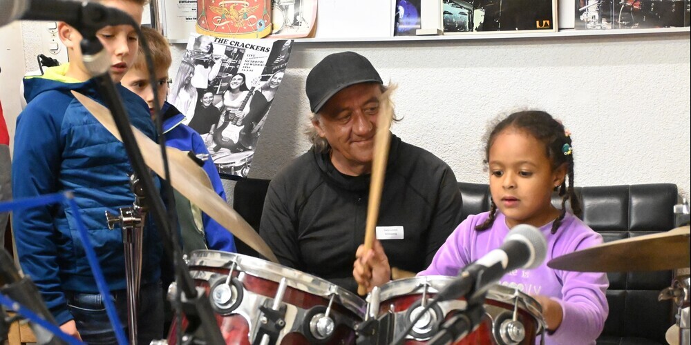 chon von Weitem waren die Drums zu hören, an denen sich Kinder versuchten. Unter der Leitung der Band-Coaches und der Schlagzeuglehrer Carlo Lorenzi, Stefan Wirrer und Tobias Spirig erfuhren die Kleinen, wie sie die Drumsticks richtig halten. Danach konnten sie spüren, wie es sich anfühlt, die Trommeln und Becken zu rühren.