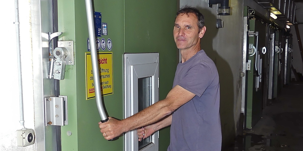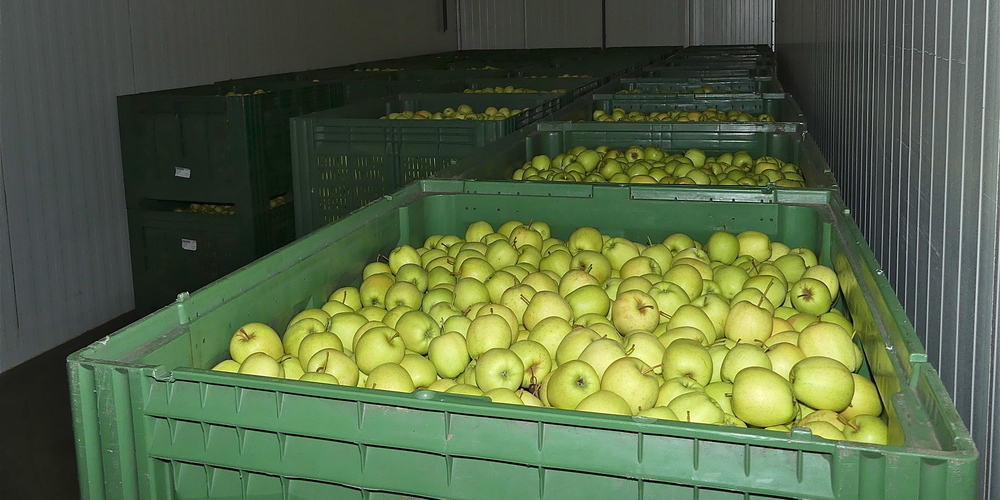 Möglich ist dies durch modernste Lagertechnik in sogenannter kontrollierter Atmosphäre. Sofort nach der Ernte kommt sowohl selbst produziertes Obst als auch von Kunden eingelagertes Obst in grossen Kunststoffkisten in einen der sechs Kühlräume, die insgesamt 350 to fassen. Wo die Äpfel dann bis in den nächsten Sommer hinein frisch wie gerade vom Baum gepflückt bleiben. Wie das geht? Vollautomatisch wird in den luftdichten Räumen eine Atmosphäre erzeugt, die beständig bei einem Grad Celsius liegt. Zusätzlich wird der Luft nach Einlagerung der Sauerstoff entzogen, bis nur mehr etwa 2-3 % Sauerstoff im Luftgemisch verbleiben. Die Äpfel wandeln dann noch einmal Sauerstoff in Kohlendioxid um, sodass nur mehr ein Prozent Sauerstoff übrig ist. Das Kohlendioxid wird je nach Sorte auf ein bis drei Prozent eingestellt. Menschen würden in dieser Atmosphäre sofort ersticken. Für die gelagerten Äpfel aber ist es sozusagen ein «Wohlfühlbad».