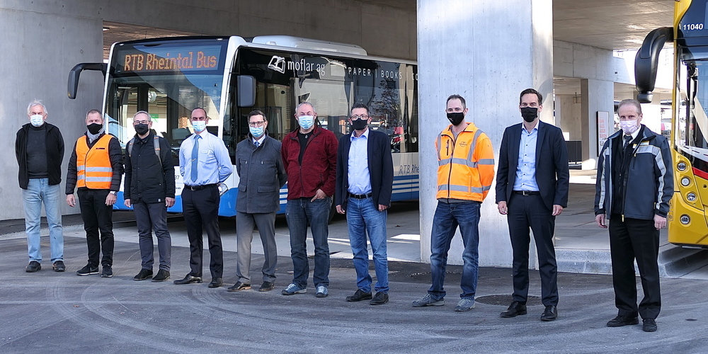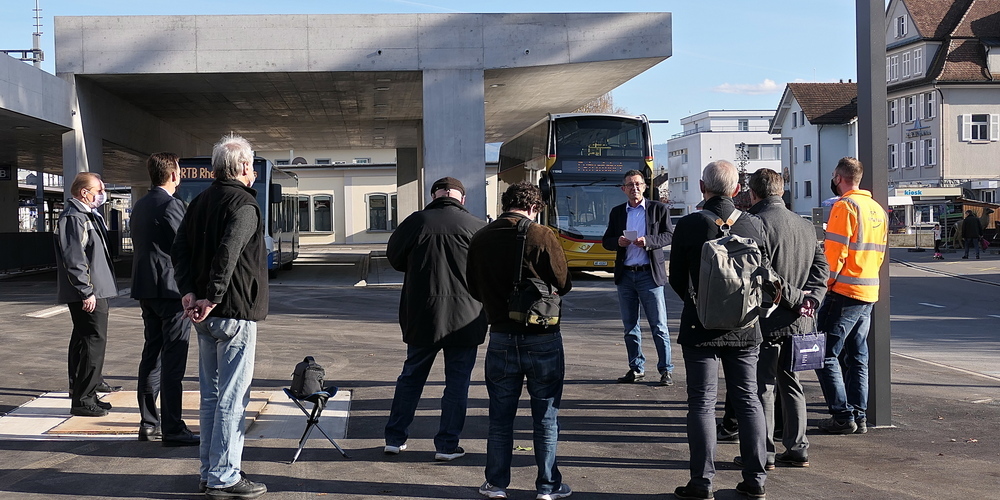 Gemeindepräsident Reto Friedauer stellte das Bauwerk an Ort und Stelle zusammen mit seinem Bauchef Claudio Pallecchi, dem Leiter des Verkaufs Ost von PostAuto Roger Walser, dem beratenden Architekten Hubert Bischoff, Markus Wüst vom Planungsbüro Bänziger Partner und Rico Kellenberger von RTB Rheintalbus vor. Die beiden Busunternehmen hatten extra zwei auf Hochglanz polierte Fahrzeuge kommen lassen, die visuell einen Ausblick auf das Geschehen nach dem kommenden Fahrplanwechsel am 13. Dezember ermöglichten, wenn der neue Busbahnof offiziell in Betrieb geht.