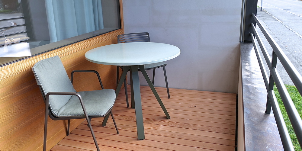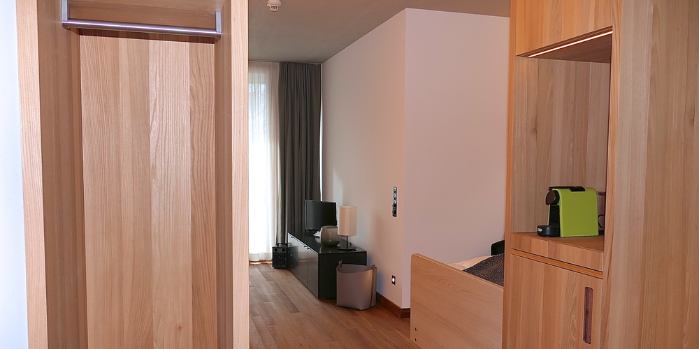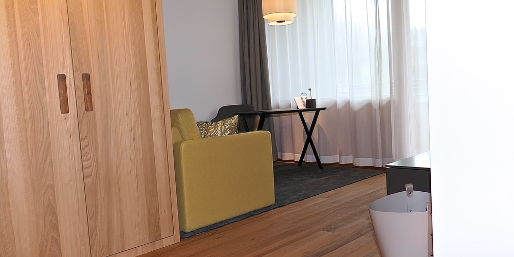 Die 102 Appartements des Alters- und Pflegezentrums Widnau werden mit 30 m2 wesentlich geräumiger als klassische Altersheimzimmer. Aussergewöhnlich auch der Grundriss: Durch einen leichten Versatz der Zimmertrennwände sind die Wohnräume in drei Bereiche gegliedert: An den Eingangsbereich mit Dusche, Waschtisch und WC schliesst sich eine Schlafnische an. Danach geht es zum offenen Wohnbereich, der auf den gedeckten Balkon führt. Das Bett kann je nach Bedarf in der Nische oder im offenen Wohnbereich mit Blick nach draussen platziert werden.