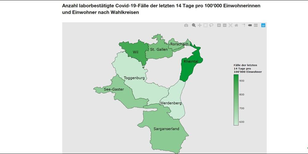 Mit 774,8 Fällen pro 100'000 Einwohnern in den letzten vierzehn Tagen verzeichnet der Kanton St.Gallen mehr Infektionen als alle anderen Kantone in der Deutschschweiz. Zum Vergleich: Zürich hat 599,7 Fälle, Thurgau 514,1 und Luzern 578 Neuinfektionen in den letzten zwei Wochen registriert und erhält – wenn es nach dem «Blick» geht – den Titel «Corona-Hotspot der Deutschschweiz».