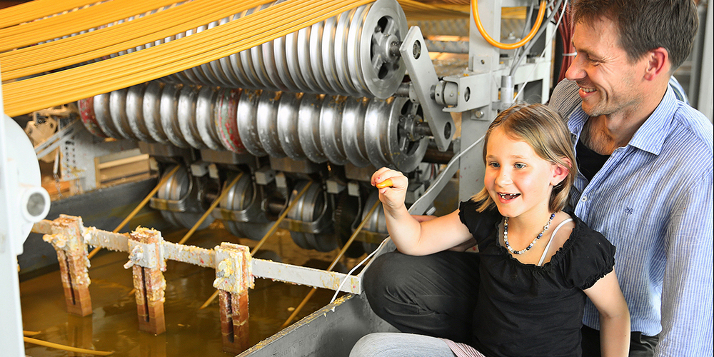 Imposant ist die Maschine, bei der über grosse Walzen und Umlenklager der noch ungeschnittene, viele Meter lange Docht von einer Spindel abgewickelt und immer wieder durch ein Bad aus heissem Wachs geführt wird. Dabei bleibt immer eine kleine Schicht Wachs am Docht haften. Wie öfter der Docht durch das Wachsbad geführt wird, umso dicker wird der Kerzenstrang. Dieser wird dann in die Länge der gewünschten Kerzen geschnitten, in Form gebracht und gelagert. Dann können je nach Wunsch der Kunden viele verschiedene Motive auf die Kerzen geklebt oder gedruckt werden. Ein echtes Handwerk eben.