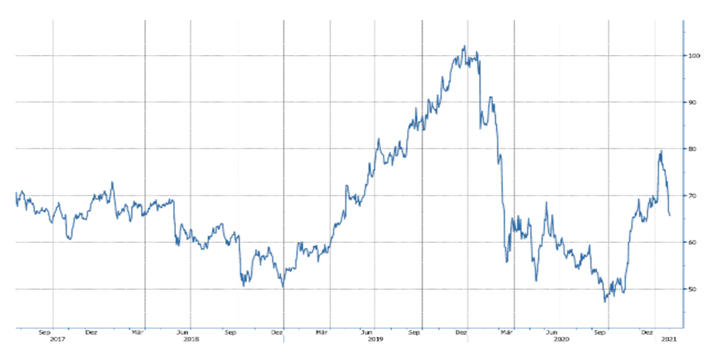 Kurs am 29.01.2021 CHF 65.80; 52 Wo Hoch/Tief CHF 95.45 / 48.18; Valor 37.115.349; geschätztes KGV 2021 36.33x; Dividendenrendite ca. 2.93%