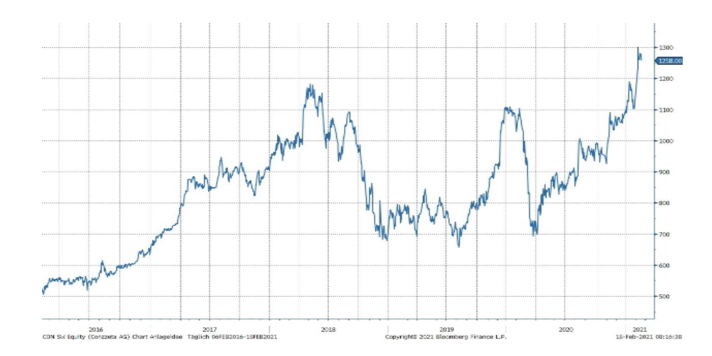Kurs am 22.02.2021 CHF 1´258.oo; 52 Wo Hoch/Tief CHF 1´310.00/716.00; Valor 24.401.750; geschätztes KGV 2021 46.27x; Dividendenrendite ca. 1.56%