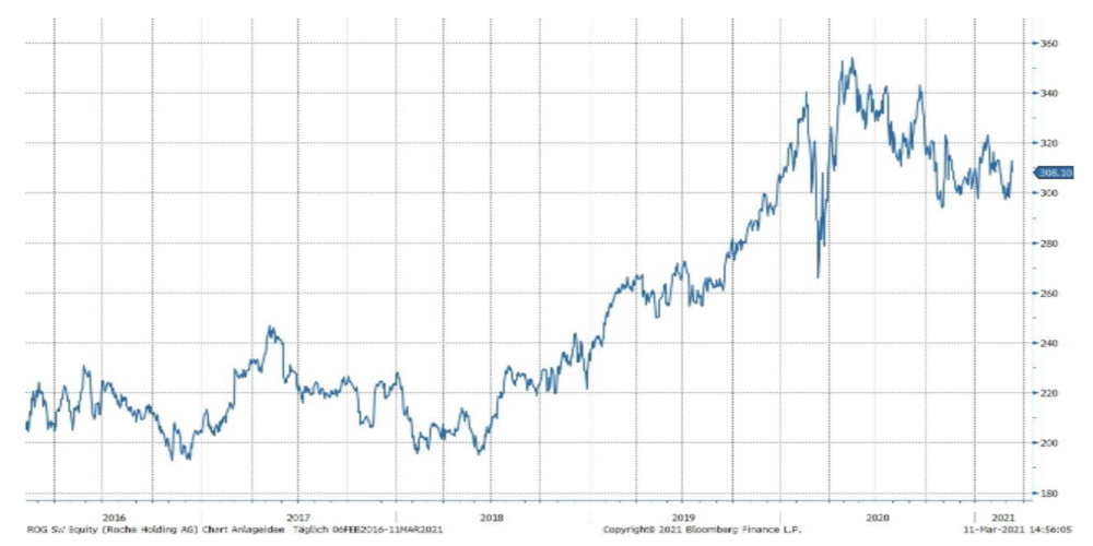 «Roche gehört zu den grössten Pharmaunternehmen der Welt. Den Fokus legt das Unternehmen auf die Behandlung von Krebs, Entzündungs- und Autoimmunerkrankungen sowie Neurologie. Im Jahr 2020 erzielte Roche einen Konzerngewinn von CHF 15.1 Mrd. Auch Roche hat die Corona-Krise zu spüren bekommen. Das operative Kernergebnis fiel um 4% auf CHF 58.3 Mrd. Nicht nur das Pharmageschäft hat unter der Pandemie gelitten, ebenso hat Roche über CHF 5 Mrd. an Umsatz bei den Blockbustern eingebüsst.