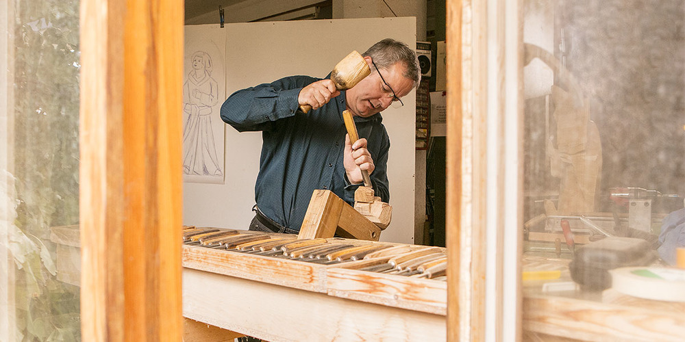 Roberts Holzschnitzereien sind weitherum bekannt. Zum Schaffensbereich von Robert Hangartner gehören Skulpturen, Reliefs und Raumgestaltungen aus Holz, sowie Plastiken meist in Bronze, wie beispielsweise der lebensgrosse Röllelibutz vor seinem Atelier. Das kleine Modell zu diesem Butz wird im Stellwerk zu sehen sein.