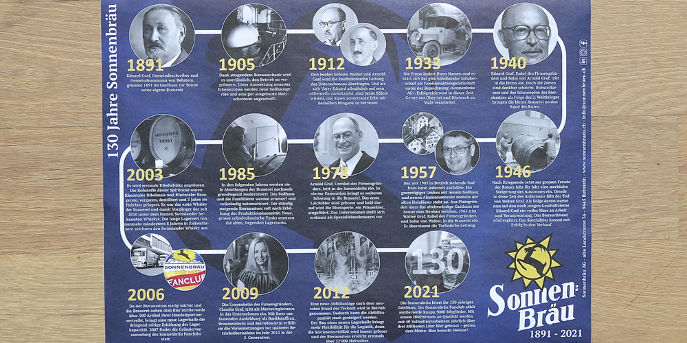 Das war noch die gute, alte Zeit, als es im Rheintal noch mehr als dreissig Brauereien gab. Eine davon ist übrig geblieben. Die Sonnenbräu AG in Rebstein feiert dieses Jahr ihr 130-jähriges Bestehen. «Wir sind in der fünften Generation tätig und setzen alles daran, damit die Sonnenbräu auch weiterhin unabhängig von Grossbrauereien hier im Rheintal ihr Bier brauen kann», stellt Firmenchefin Claudia Graf fest. Traditionell lanciert die Brauerei im Jubiläumsjahr ein neues Bier, so auch zum 130. Geburtstag.