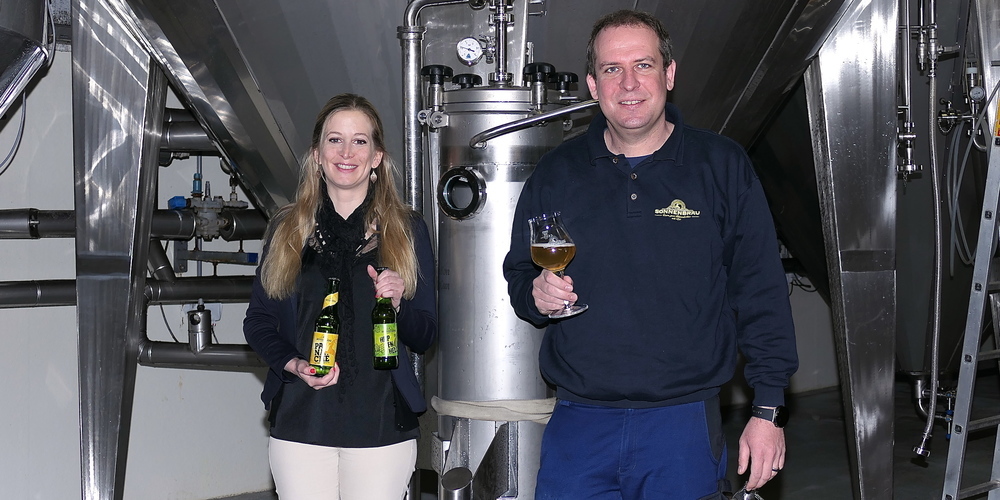 Mit sichtlicher Begeisterung und voller Stolz präsentieren die Chefin und ihr Braumeister Steffen Pawlak die neue Bierspezialität. Ein Bier, dass es so in der Schweiz kein zweites Mal gibt. Denn das neue «Hopfen hell» ist eine Kombination aus zwei beliebten Bierstilen. «Inspiriert hat uns bei der Entwicklung unser Lager hell und das Craftline IPA», plaudert Braumeister Steffen Pawlak aus dem Nähkästchen. Entstanden ist ein kaltgehopftes Lager hell mit 4.8 Volumenprozent Alkohol. Beim Kalthopfen werden nur die Hopfenaromen aufgenommen, nicht jedoch die Bitterstoffe. Durch diesen Arbeitsschritt erhält das Sonnenbräu Hopfen hell einen fruchtigen und mild hopfigen Geschmack. «Bei der Entwicklung des Bieres war uns wichtig, dass das Bier sowohl den Lagerbier-Trinker als auch den IPA-Liebhaber anspricht. Es ist süffig, fruchtig im Geruch, aber nicht bitter» so Pawlak. Mit dem frischen, neuen Design verspricht das naturtrübe Bier Trinkgenuss zu jeder Gelegenheit.