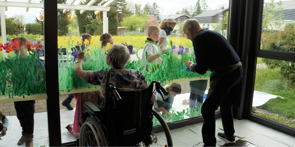 Das Besondere dabei war, dass die Schülerinnen und Schüler die grossen Glasscheiben von aussen und die Bewohnerinnen und Bewohner dieselben Flächen gleichzeitig von innen bemalten. So entstand, ganz „coronakonform“ und unbedenklich, ein einmaliger Kontakt und Austausch und ein sich ergänzendes Gesamtwerk.