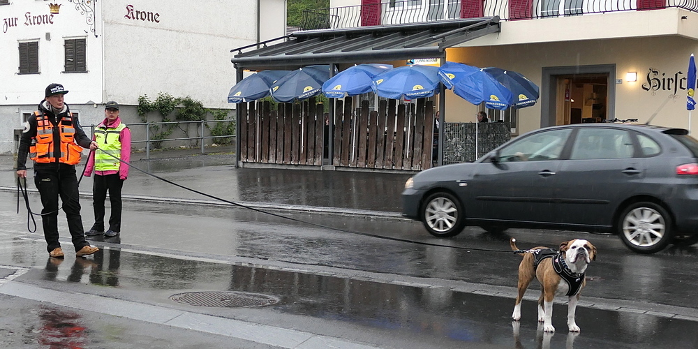 Seltsames spielt sich im Ortskern von Montlingen ab. Personen mit reflektierenden Warnwesten laufen im Starkregen durch das Dorf. Manche mit einem Hund an der Leine. Was ist da los?