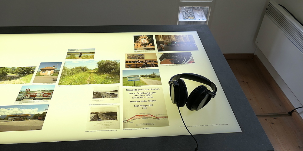 Im Erdgeschoss des Stellwerks wartet dann noch eine Collage von Bildern des von Miro Schawalder gemeinsam mit Florian Wegelin und Elias Gross erarbeiteten Hörspaziergangs „Grenzschleusen im Rheinvorland“, der sich mit der Ausbeutung von Kriegsgefangenen zum Ausbau der Wuhrbauten entlang des Rheins befasst. Historisch geprägte Kunst, deren Wichtigkeit nicht hoch genug eingeschätzt werden kann. Denn bald wird auch jene Generation nicht mehr sein, die die Geschichten der unerträglichen NS-Zeit noch von ihren Grossvätern und Vätern erzählt bekommen haben.