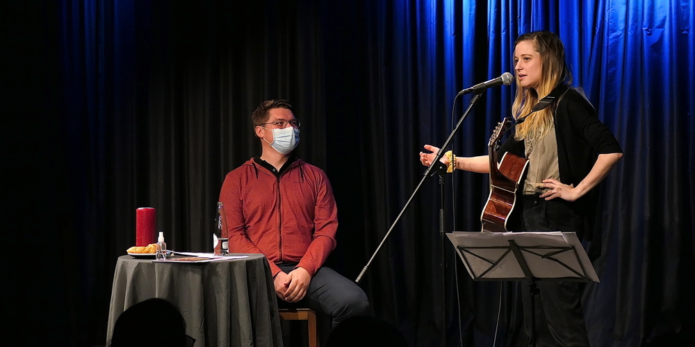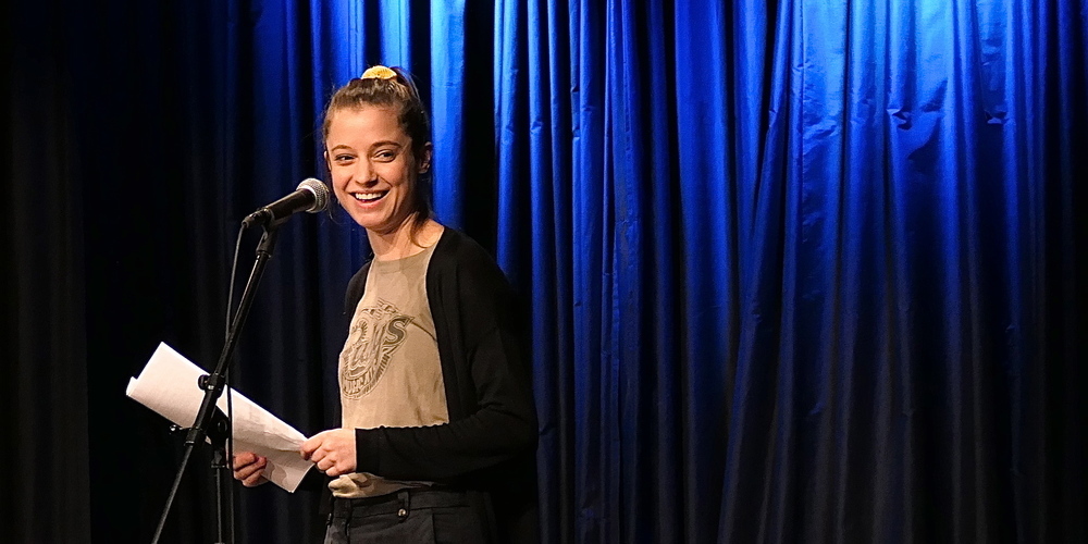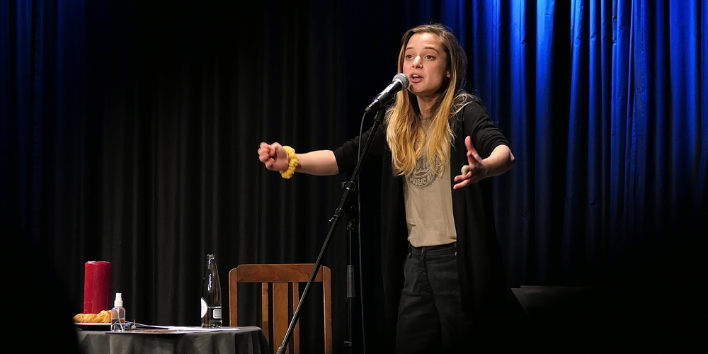 Der aktuelle Shooting-Star der Schweizer Comedy Lara Stoll ist ein energiegeladenes Persönchen. Immer in Bewegung, immer ihr schauspielerisches Talent ausnutzend, hantelt sie sich auch bei ihrem Auftritt vor den fünfzig Besuchern im coronabeschränkt ausverkauften Diogenestheater von Text zu Text, von Nummer zu Nummer.