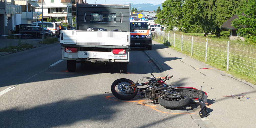 Am Freitagabend ist es auf der Rorschacherstrasse in Lüchingen zu einer Auffahrkollision zwischen einem Motorrad und einem Lieferwagen gekommen. Der 22-jährige Motorradfahrer wurde mit unbestimmten Verletzungen durch die Rega ins Spital geflogen.
