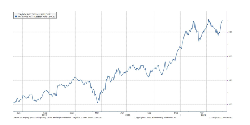 VAT zeigt sich nach einem starken 1. Quartal 2021 sehr zuversichtlich für den weiteren Jahresverlauf. Demnach dürfte der Umsatz im Gesamtjahr substanziell über den im Vorjahr erreichten Wert von CHF 692 Mio. steigen. Bereits im 1. Quartal kletterten die Verkäufe um mehr als 30% und für das 2. Quartal stellt VAT mit einem Umsatz im Bereich von CHF 205 bis 215 Mio. ein Wachstum von rund 20% oder mehr in Aussicht. Der Vakuumventil-Hersteller VAT ist Marktführer eines attraktiven Nischenmarktes und verfügt über eine attraktive Profitabilitätsstruktur in einem strukturell wachsenden Markt. Trotz der hohen KGV-Bewertung von 44.11x, sind wir überzeugt, dass die Aktien noch Potential haben.»