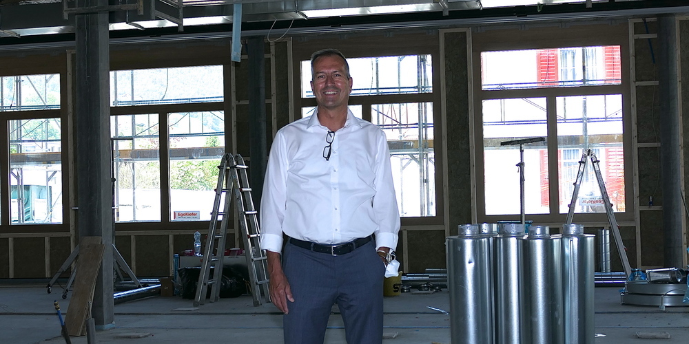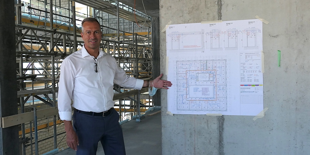 «Die Aussenhülle ist fertig, der Innenausbau wird gerade mit Hochdruck in Angriff genommen!» Ein sichtlich mit dem Baufortschritt zufriedener René Bognar, Vorsitzender der Clientis-Biene-Bank Geschäftsleitung, führt rheintal24 durch das schnell gewachsenen Rohbau des neuen Bankgebäudes. «Jetzt kommt das Aussengerüst weg, dann sieht man den Bau in seiner meiner Meinung nach äusserst gelungenen Architektur.» Rheintal24 hatte bereits von der virtuellen Grundsteinlegung für die neue Clientis-Biene-Bank berichtet.