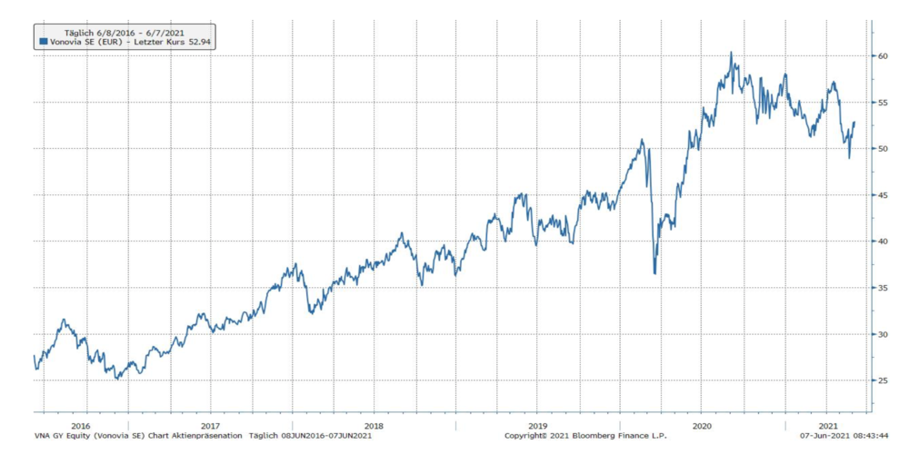 «Dem deutschen Immobilienkonzern Vonovia gehören über 400'000 Wohnungen in Deutschland, Österreich und Schweden. Das Unternehmen hat das regional am stärksten diversifizierteste Portfolio in seiner Vergleichsgruppe. Die Zahlen zum 1. Quartal 2021 zeigen, dass die Corona-Krise sich kaum auf die operative und finanzielle Entwicklung auswirkte. Zudem profitiert Vonovia von seinen Zukäufen in Schweden, wohnungsnahen Dienstleistungen sowie Neubauten. Im 1. Quartal 2021 legte der operative Gewinn im Jahresvergleich um 14.1% auf EUR 382.9 Mio. zu. Die Miete erhöhte sich gegenüber Ende 2020 im Schnitt auf EUR 7.18 pro Quadratmeter.
