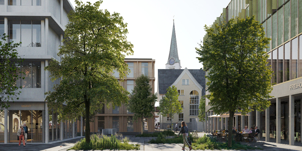 - ein neues Raiffeisenbank-Gebäude am Standort der heutigen Freihof-Liegenschaft mit Tiefgarage und der Möglichkeit eines zusätzlichen Wohn- und Gewerbehauses.