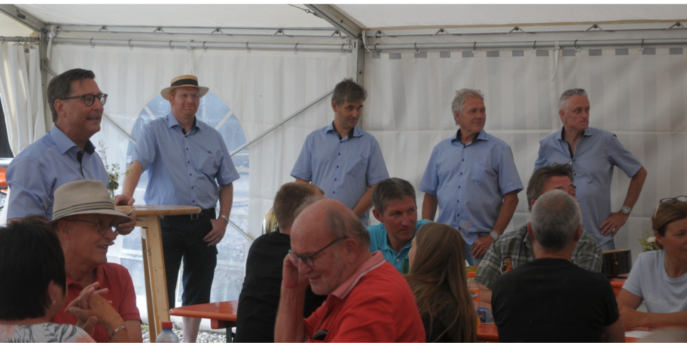 Beim Posten 2 nahm der Präsident, Rico Kellenberger, die Besucherinnen und Besucher in Empfang. Er gab ihnen Einblick in die Arbeit des Ortsverwaltungsrates und zeigte auf einem Poster, das im Auer Riet realisierte „Zebra-Biotop“. Anschliessend erfolgte die Fahrt zum Ziel. Beim Auhof übernahm Jörg Geiger, der Pächter der Ortsgemeinde Au, das Zepter. Er zeigte den Gästen mit Stolz, wie seine Arbeit auf dem Hof verläuft. Vor allem der vollautomatische Melkroboter verblüffte die Interessierten. Am Schluss wurden die Feldbegehungsbesucher im Festzelt mit tatkräftiger Unterstützung der Männerriege Au sehr wohlwollend verköstigt. Für die musikalische Unterhaltung hat der Organisator, Urs Lenz verantwortlich für Feld und Riet in der Ortsgemeinde Au, gesorgt. Die Ortsgemeinde Au bedankt sich bei den teilnehmenden Bürgerinnen und Bürgern für ihr Interesse. Auch die Teilnahme der Vorarlberger Gäste und der benachbarten Ortsgemeinden freute die Organisatoren.
