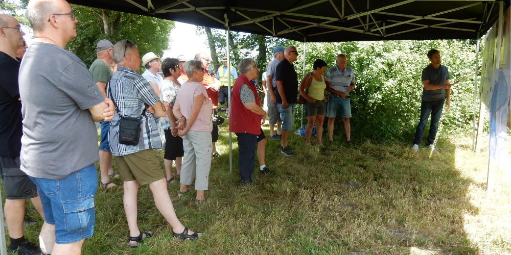 Bei schönstem Wetter fuhren die Besucher mit dem Velo in vier verschiedenen Gruppen zum Auhof. Auf dieser Fahrt wurde an zwei Posten Halt gemacht. Beim Posten 1 informierte Roland Hollenstein über den Hochwasserschutz Binnenkanal. Er erklärte das gesamte Projekt an einer Plakatwand sehr ausführlich. Die gestellten Fragen wurden kompetent und verständlich beantwortet.