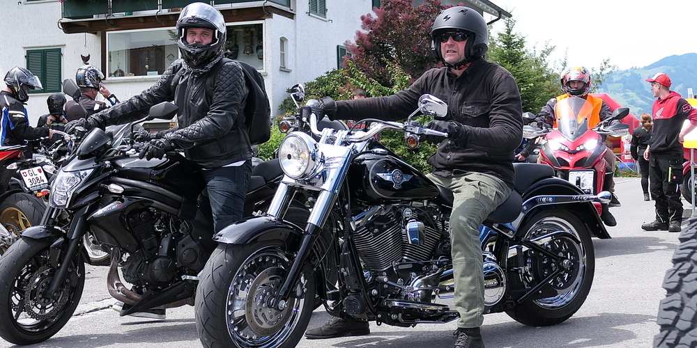 Chromblitzende Motoren und Auspuffanlagen, fette Reifen bei den Harleys, Helme aller Formate und Designs sowie Bekleidung von der guten alten Lederkombi über moderne Funktionskleidung bis zu Jeans und leichten Jacken waren zu sehen. Dazu die Motorräder vieler Fabrikate. Neben den grossen Vier aus Japan, wie Honda, Yamaha, Kawasaki und Suzuki, waren auch auch Exoten zu sehen, wie eine Brixton, eine Bullit, dazu Uralt-Geräte wie die AJS oder eine alte Guzzi. Und natürlich Ducatis, Triumph und BMWs.