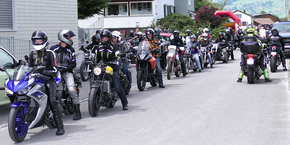 Ein beeindruckendes Bild. Samstag, pünktlich um 14.00 Uhr starteten die Motorradfahrer alle gemeinsam zur Ausfahrt. Bike an Bike reihte sich die lange Kolonne ein, die zunächst Richtung Walzenhause donnerte, um dann über Heiden und Berneck wieder nach Oberriet und Kriessern zurückzukehren.
