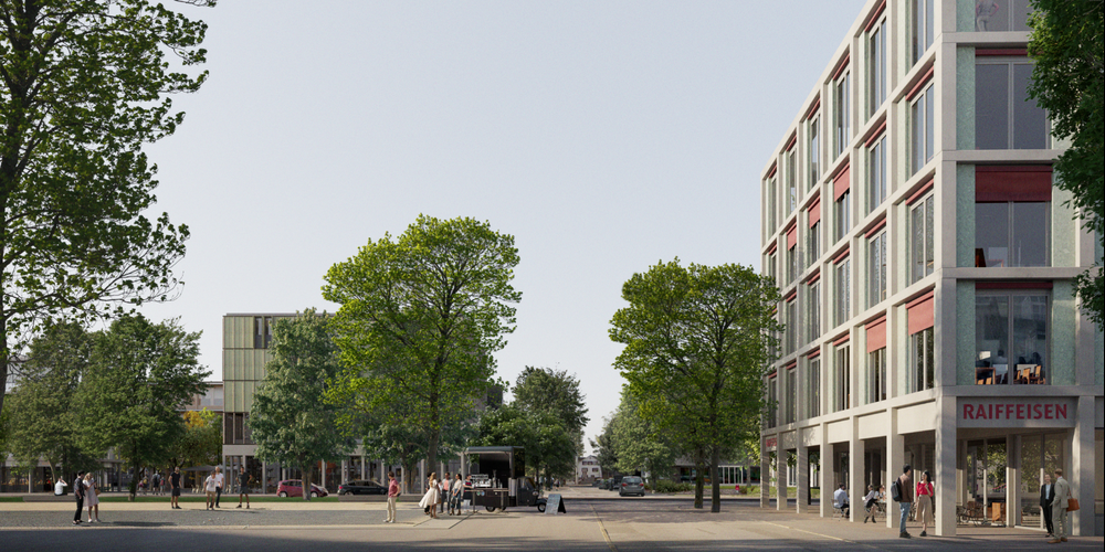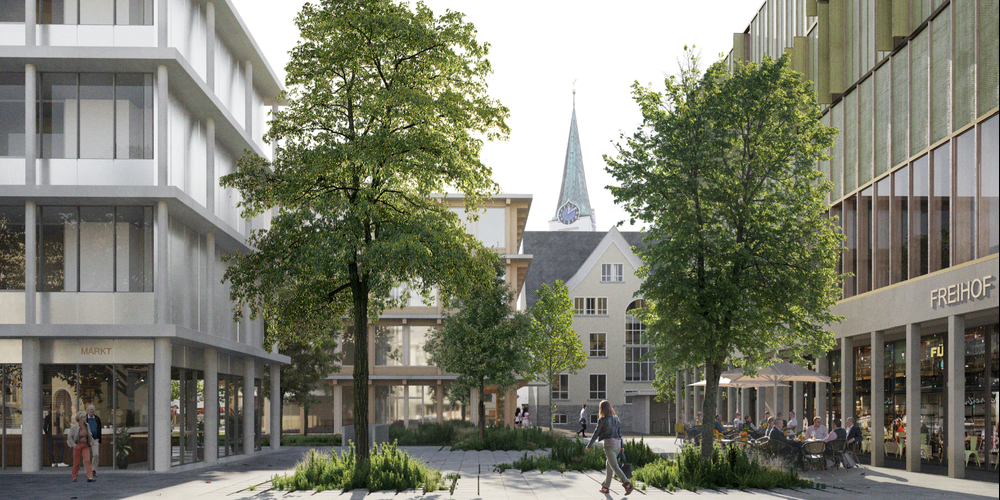 - ein neues Raiffeisenbank-Gebäude am Standort der heutigen Freihof-Liegenschaft mit Tiefgarage und der Möglichkeit eines zusätzlichen Wohn- und Gewerbehauses