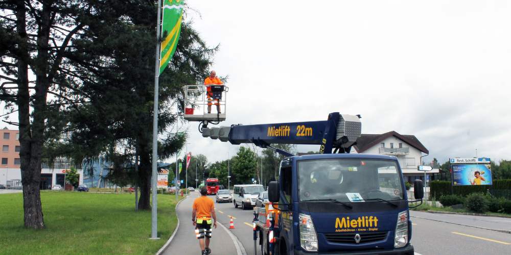 Zwei Mitarbeiter des Unterhaltsdiensts der Gemeinde Diepoldsau haben heute entlang der Hohenemser- und Tramstrasse die neuen Fahnen aufgehängt. 90 Fahnen hängen seit heute an der Strasse zwischen Rheinbrücke und Zollamt. Die neue Beflaggung ist aus Titan-Polyester im Siebdruckverfahren produziert worden.