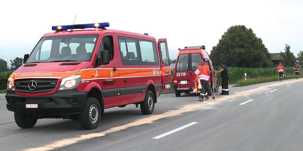 Harter Einsatz für die Feuerwehrleute von Diepoldsau bis Montlingen. Denn ein Traktor hatte auf der gesamten Strecke zwischen diesen beiden Orten eine Ölspur gezogen.