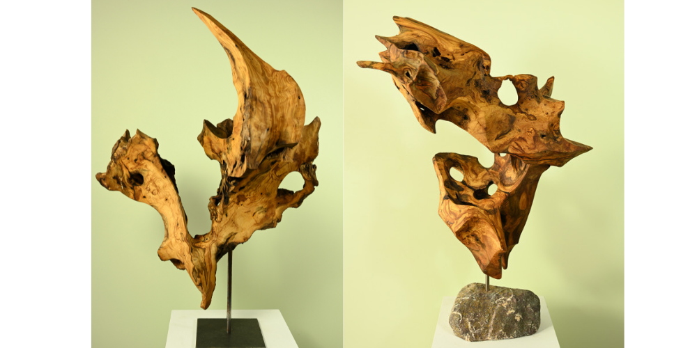 Jürg Eggenbergers Fundholzskulpturen werden grösstenteils hier bearbeitet. Gegenüber, in der Scheune des Nachbarhauses, befindet sich ein Showroom mit den fertigen Werken. Momentan sind es ziemlich viele, da wegen Corona schon länger keine Ausstellungen mehr stattgefunden haben und sich in dieser Zeit einiges angesammelt hat.