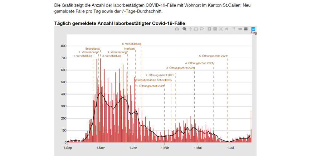 Grundsätzlich ist seit Juli ein stetiger Anstieg aller Indikatoren zu verzeichnen, während die Zahlen zuvor zurückgegangen waren. Die Zahl der Neuansteckungen steigt gemäss Taskforce in allen Altersgruppen signifikant, ausser in jener der 65 bis 74-Jährigen. Bei den Hospitalisationen war der Anstieg bei den 35- bis 44- und den 55- bis 64-Jährigen besonders gross. Die Zahl der täglichen laborbestätigten Todesfälle über die letzten 14 Tage lag zwischen 1 und 5.
