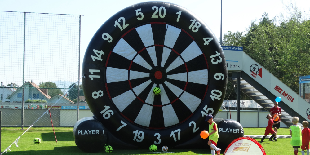 Für die Kinder und die Trainer startet der Trainingstag jeweils um 09:45 Uhr. Um 11:30 Uhr geht es dann zum gemeinsamen Mittagessen, welches das eigene Küchenteam vorbereitet hat. Um 16:15 Uhr neigt sich der Tag für alle Beteiligten und mit viel neuen Erfahrungen im Gepäck dem Ende zu. Die Kinder sind zwar sehr müde, aber die Vorfreude auf den nächsten Tag ist ihnen ins Gesicht geschrieben. Kein Wunder, denn in diesem Jahr warten die Organisatoren mit einem speziellen Highlight auf - eine grosse Fussball-Dartscheibe.