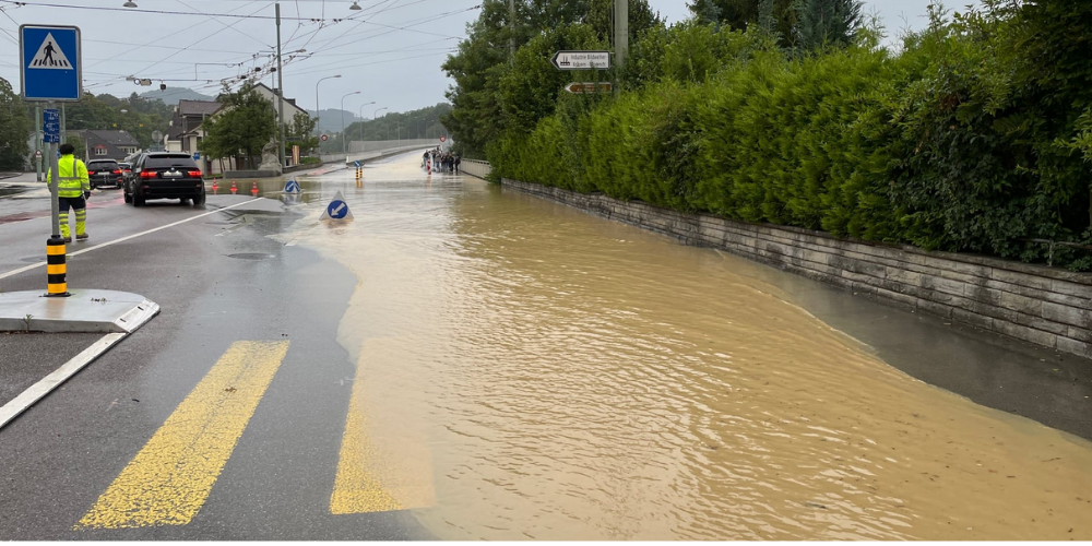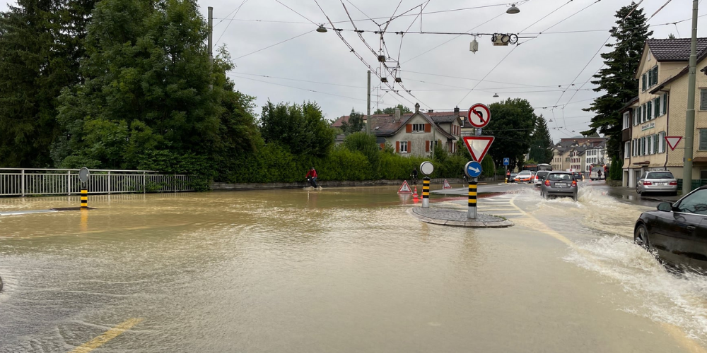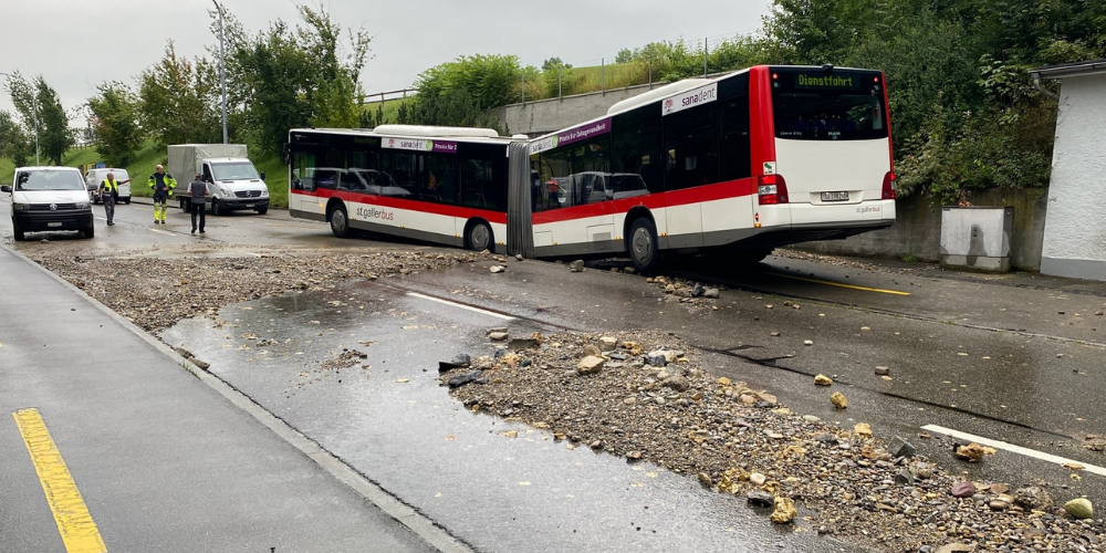 Die Strasse wurde dabei stark unterspült und viel Schlamm sowie Steine wurden auf die Fahrbahn geschwemmt. Aufgrund der unterspülten Strasse brach ein Bus in ein Loch ein. Die rund 20 Fahrgäste blieben unverletzt, teilt die Stadtpolizei auf Facebook mit.