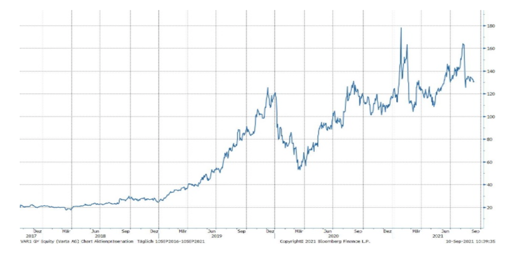 «Varta ist ein traditionsreicher Batteriekonzern mit Sitz in Baden-Württemberg. Der Konzern hat im 1. Halbjahr 2021 eine Atempause vom rasanten Wachstum der vergangenen Jahre eingelegt. Varta konnte den Umsatz um 1.8% auf EUR 397.6 Mio. steigern. Die Erwartungen wurden dabei leicht verfehlt. Das EBIT lag mit EUR 112.3 Mio. auch etwas unter den Erwartungen der Analysten. Punkto Profitabilität ist das Unternehmen auf Kurs. Das EBITDA-Margenziel von 30% sollte in diesem Jahr erreicht werden. Die für das 2. Halbjahr angekündigten Kundenaufträge laufen derzeit an.