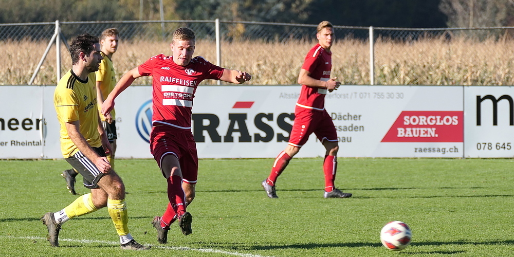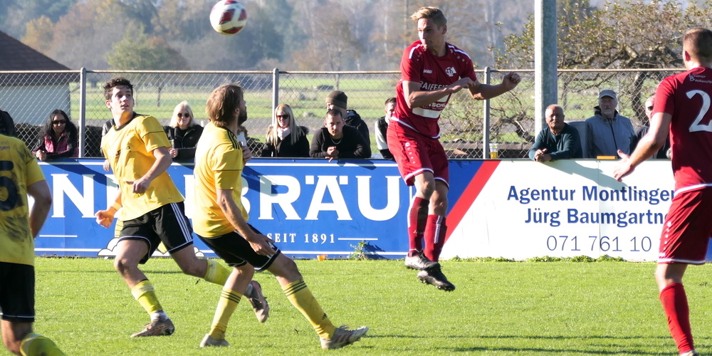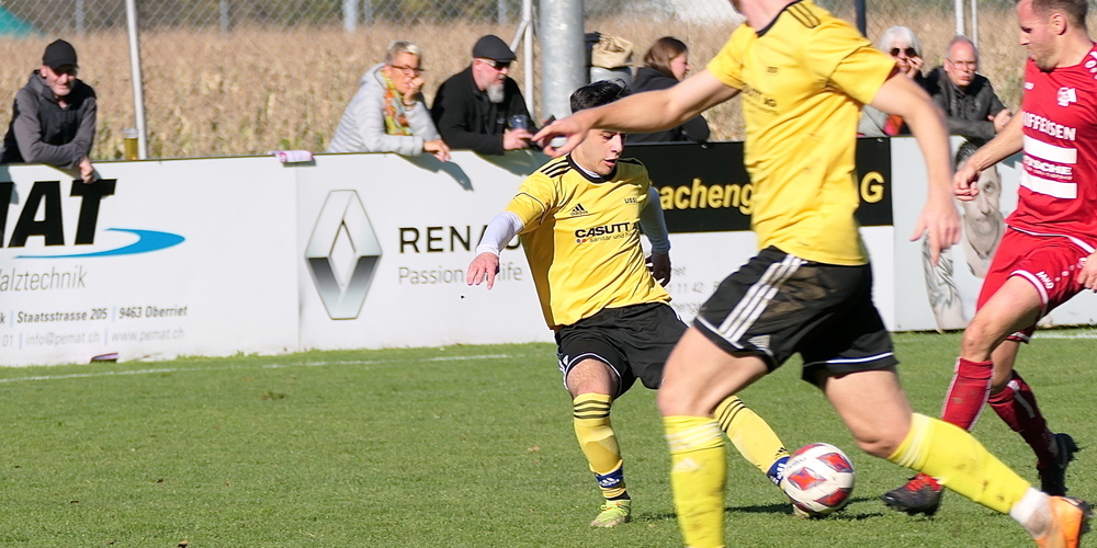 Sein Tor zum alles entscheidenden 4:2 in der letzten Minute der regulären Spielzeit war ein direkt verwandelter Freistoss aus etwa 25 Metern ausserhalb der linken Strafraumecke. Die Gäste trauten sich, nur drei Mann in die Mauer zu stellen. Was sich rächte. Denn Haudegen Istrefi nahm kurz Mass und zirkelte die Lederkugel rechts mit Drall um die Abwehrmauer herum direkt ins linke Kreuzeck. Ein Meistertor! Und gleichzeitig das Ende dieser Partie, die den FC Montlingen aus der Abstiegszone auf Rang zehn der Tabelle beförderte, direkt vor dem FC Au-Berneck.